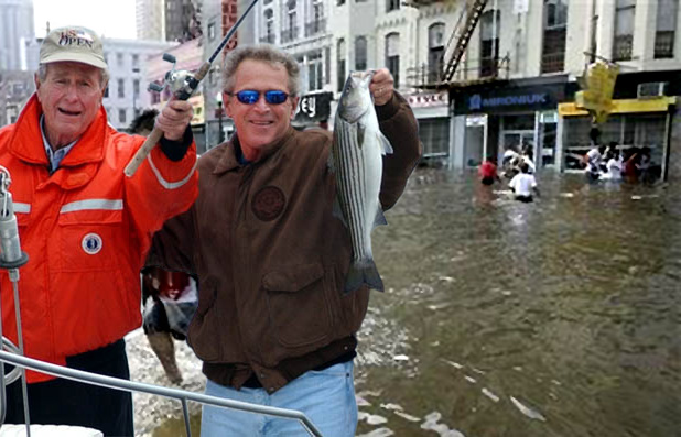 (Pictured below)Bush and his father fishing in New Orleans after Katrina.